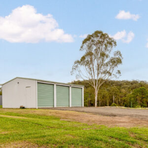 * Freestanding Colorbond shed for three cars, suitable as a workshop or mixed-use space