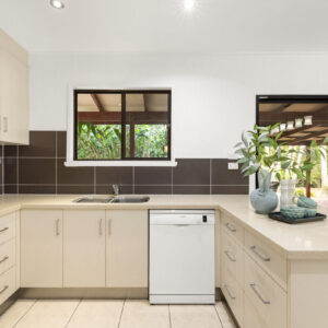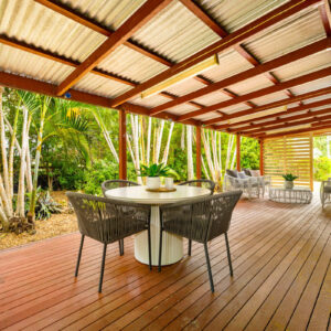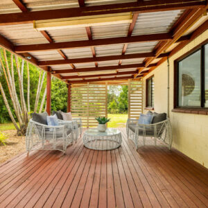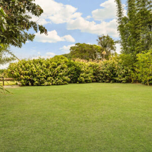 The large yard outside is secure and fully fenced and with established trees travelling along the fence line, the entire ¾ acre block has been planned with a focus on functionality with privacy. A leafy hedge borders the entry-way verandah along the front of the home, and the rear veranda, that is extra wide for relaxing and entertaining, is also surrounded by greenery. The level and lush front yard is perfect for kids’ play, while the rear has been set up for hens and gardening.