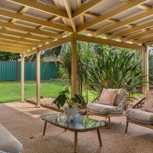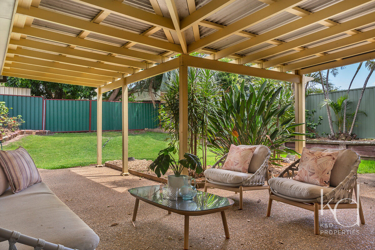 Step outside to the covered patio, an idyllic spot for alfresco dining or simply enjoying the peaceful surroundings. The backyard is a private sanctuary, with a lush lawn and established gardens, offering a safe space for children to play and adults to unwind.