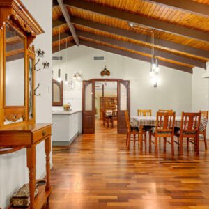 At the heart of the home is an open plan kitchen, living and dining space with high raked ceilings that immediately enhance the feeling of space. A second, more formal living area provides a welcoming retreat with fireplace, second dining with servery access to the kitchen, and a defined entry, creating excellent separation between everyday living and quieter zones. Both living areas open directly to a fully covered and paved front courtyard, connecting indoor and outdoor spaces in a way that feels both practical and inviting.