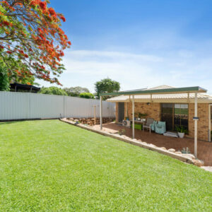 Outside, a covered patio stretches across the rear of the home, overlooking a private backyard with new fencing and simple, low maintenance landscaping. At the front, a wide driveway leads to a spacious double garage with automatic doors and internal access, providing secure parking and convenient entry into the home.